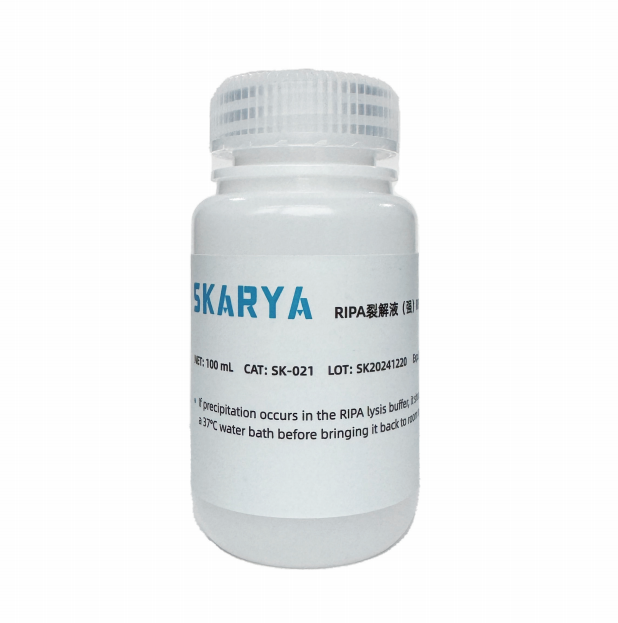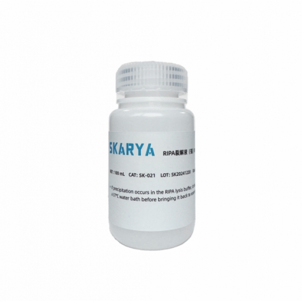 RIPA裂解液(RIPA Lysis Buffer)能够快速高效地裂解贴壁和悬浮培养的哺乳动物细胞,从而收集细胞中的蛋白质。大多数抗体和蛋白质抗原不受RIPA裂解液成分的影响。此外,RIPA 缓冲液可Z大限度地减少非特异性蛋白质间相互作用,从而保持低背景,同时允许大多数特异性蛋白质间相互作用发生,便于研究相关的蛋白质-蛋白质相互作用。RIPA裂解液裂解得到的蛋白样品可以用于常规的Western、IP、Co-IP等。1 mL RIPA裂解液足以裂解一个100 mm培养皿(0.5 至 5 × 107 个细胞)的贴壁哺乳动物细胞或50 mg哺乳动物组织。RIPA裂解液的配方有很多种,根据其裂解细胞的强度大致可以分为强、中、弱三类。